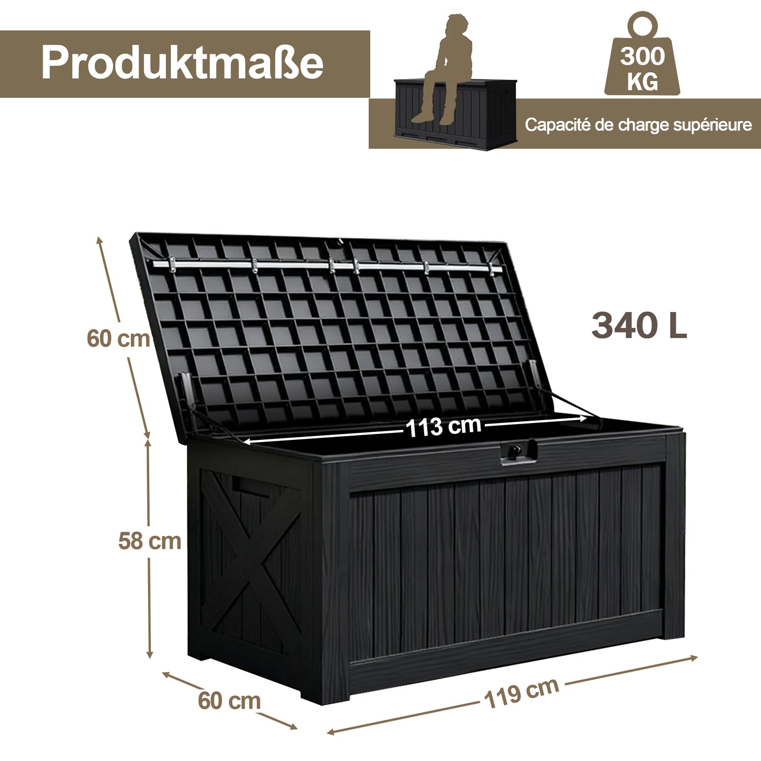 Diese Aufbewahrungsbox ist mehr als nur Stauraum: Sie lässt sich ebenso als zusätzliche Sitzgelegenheit oder Beistelltisch nutzen und trägt das Gewicht von bis zu zwei Erwachsenen. Ob als Sitzplatz, Ablage für Getränke oder zur Aufbewahrung verschiedener Gegenstände – sie ist eine vielseitige Ergänzung für jeden Außenbereich.