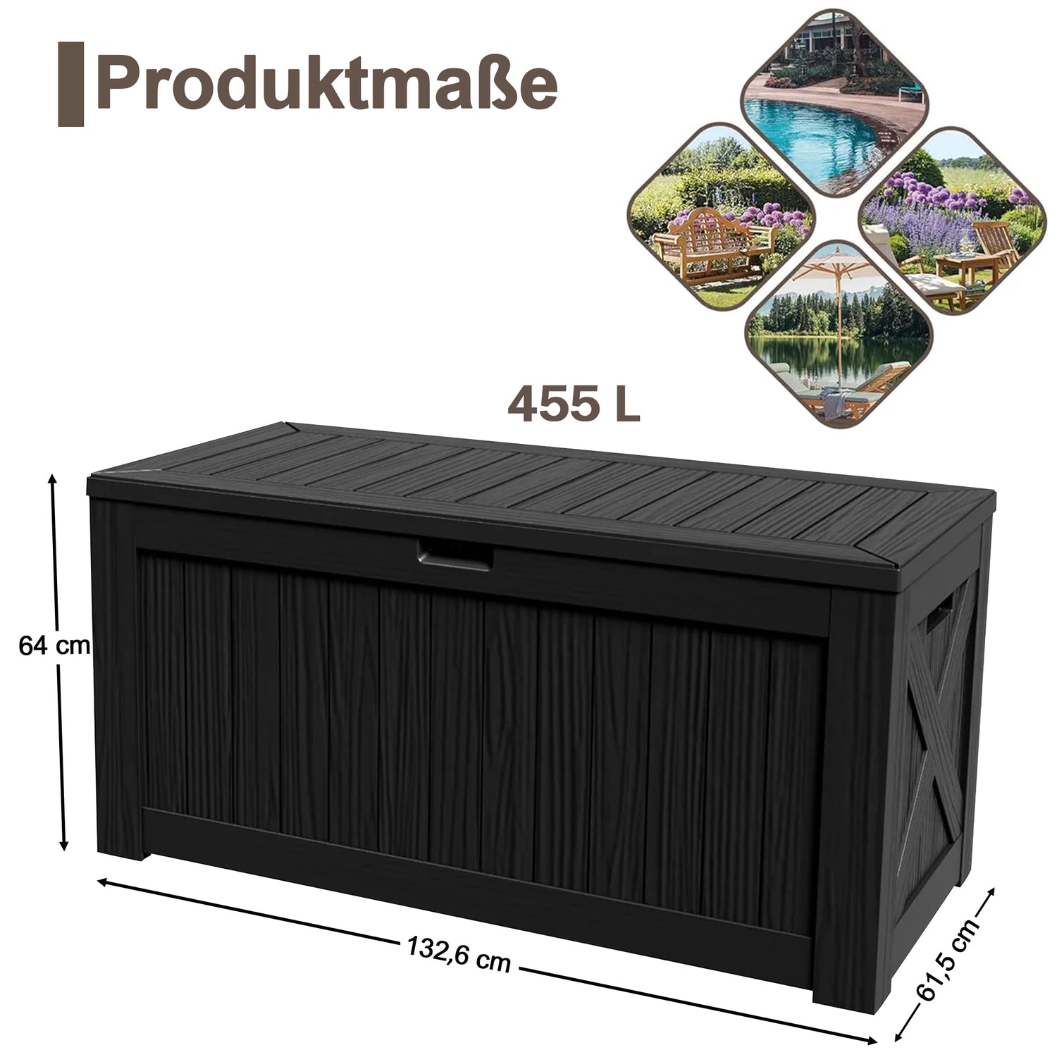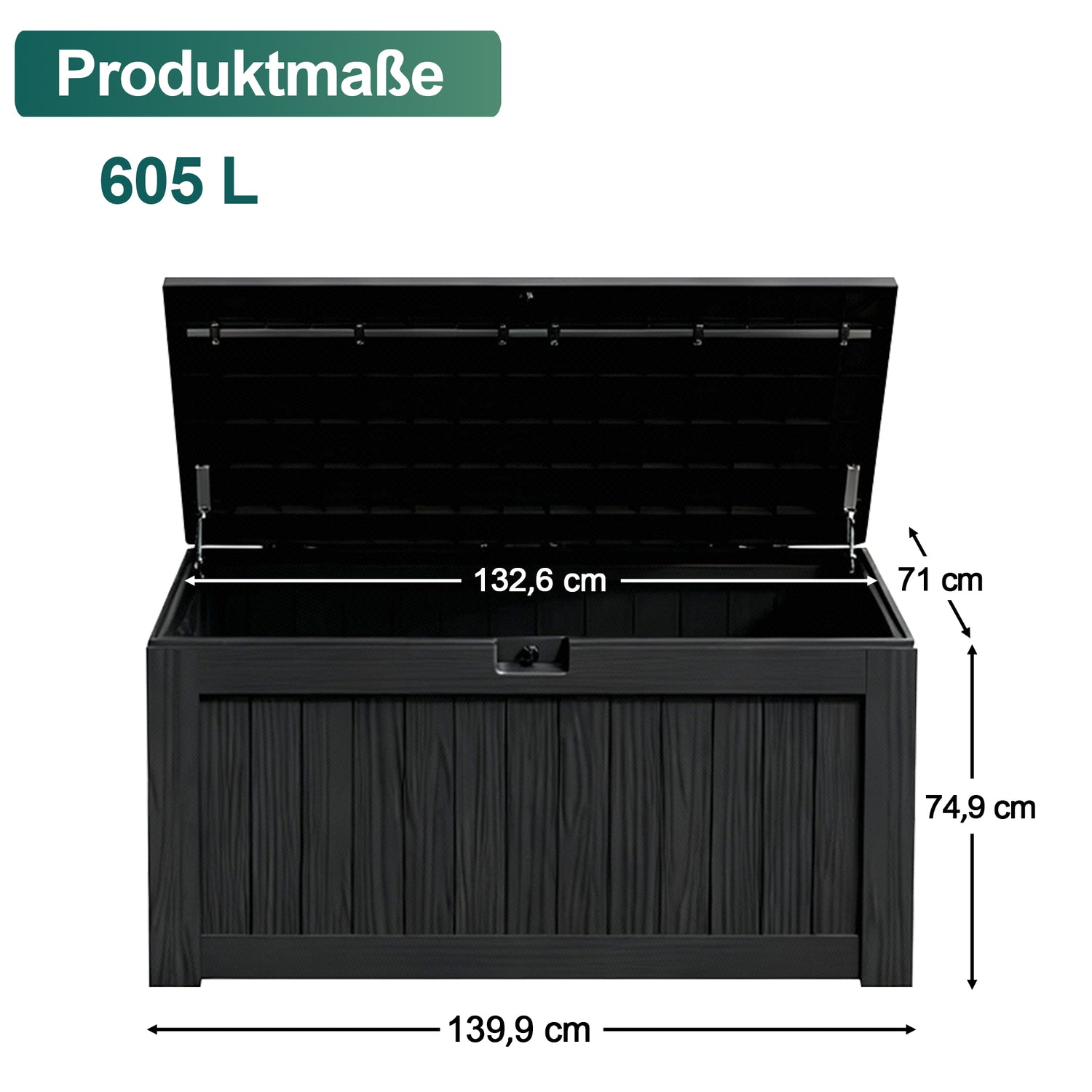Halten Sie Ihren Außenbereich aufgeräumt, übersichtlich und stilvoll – mit der Patioslife Outdoor-Aufbewahrungsbox.Ausgestattet mit einem stabilen Metallrahmen, Gasdruckfedern für ein leichtes und sicheres Öffnen sowie einem abschließbaren Deckel für zusätzlichen Schutz eignet sich diese Aufbewahrungsbox ideal zur Lagerung von Sitzpolstern, Gartengeräten, Poolspielzeug und Terrassenzubehör.Erhältlich in Größen von 340 bis 605 Litern, ist sie die ideale Lösung für jeden Außenbereich, der Funktionalität, Sicherheit und ansprechendes Design miteinander verbinden möchte.