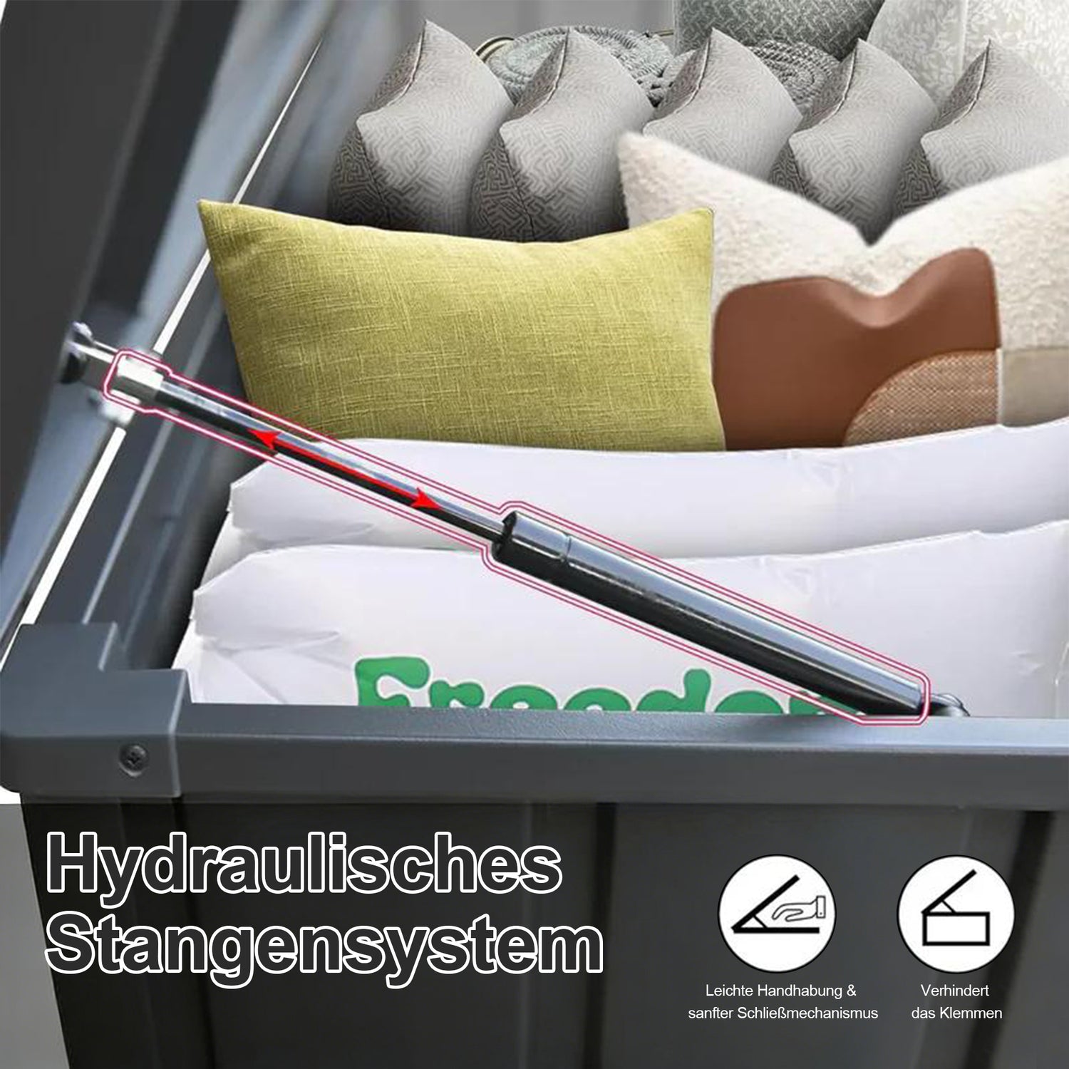 Die Patioslife Aufbewahrungsbox ist mit leichtgängigen hydraulischen Gasdruckfedern ausgestattet und ermöglicht ein müheloses Öffnen und Schließen. Kein schweres Anheben, kein Kraftaufwand – der Deckel öffnet sich bereits bei leichtem Druck sanft und schließt kontrolliert sowie sicher. Ideal für Familien, Senioren und alle, die bei der Aufbewahrung im Außenbereich Wert auf Komfort und praktische Handhabung legen.